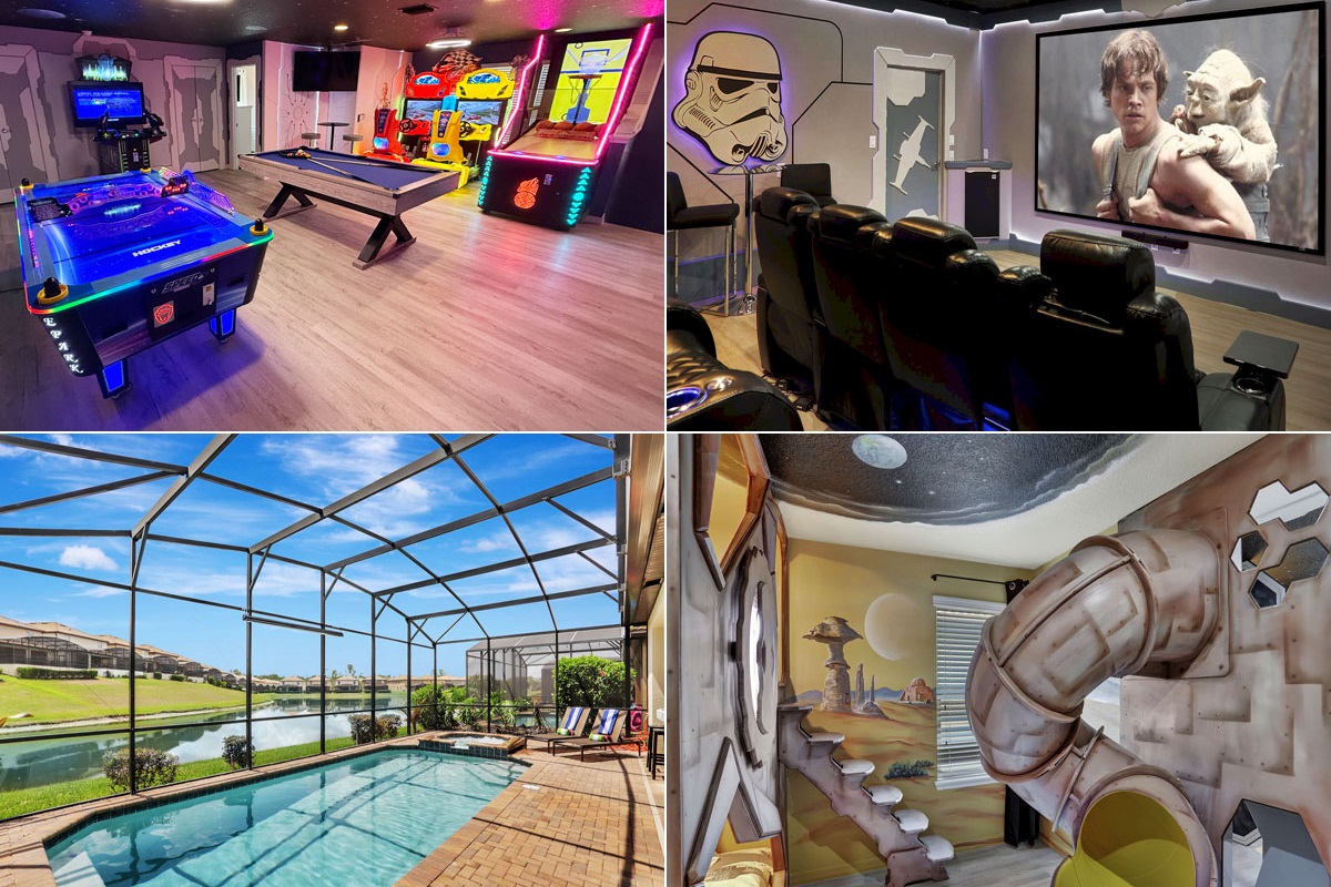 Home Highlights: Beautiful Vacation Home Loaded with Fun - Incredible Star Wars Theme Arcade Game Room - 2 Movie Theaters (one inside the home and one poolside) - 3 Themed Bedrooms w/Slides - Private Southeast Facing Heated Pool/Spa (heating extra $) - Covered Lanai with Bar and TV - 6 King Suites